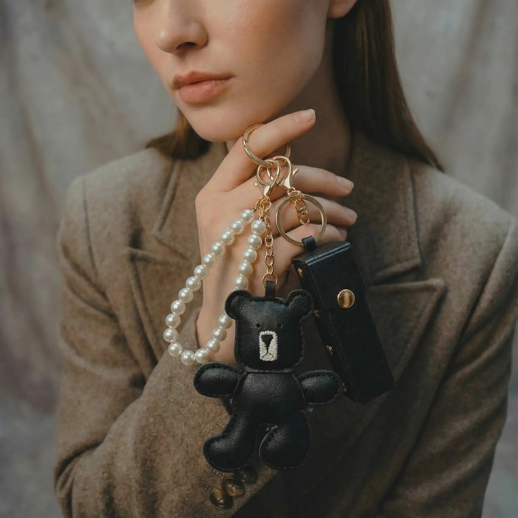 Crafted from sleek black faux leather, this modern bear keychain brings a minimalist-luxury vibe to your everyday style. Paired with a pearl charm chain for a feminine, polished touch and a matching black lipstick holder for true on-the-go practicality, it’s the accessory that does more than just look good.